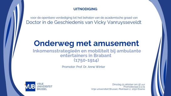 SHOC is proud to announce that on 21 October, SHOC member Vicky Vanruysseveldt will defend her doctoral thesis : "On the road with entertainment. Income strategies and mobility among itinerant entertainers in Brabant (1750-1914)", supervised by Prof. Dr. Anne Winter