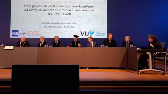 On Monday, 22 September, our colleague Jurriaan Wink successfully defended his PhD in Amsterdam. His research—part of a joint doctoral project supervised by Bart Lambert (VUB) and Louis Sicking (VU Amsterdam)—explored how merchants in 15th-century Kampen, Utrecht, and Zutphen were supported by their hometowns. A proud SHOC delegation was there to cheer him on and celebrate the occasion with some well-chosen gifts. Huge congratulations, Dr Wink
